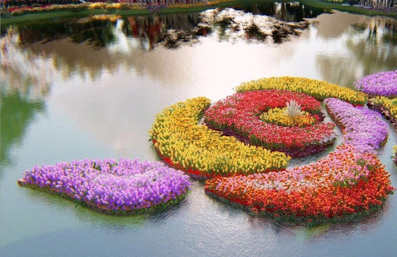在花朝節(jié)期間利用各種花卉組成了一座玫瑰花型的小島,漂浮在西溪濕地花朝節(jié)入口的湖中,與周圍的花橋花溪相映成趣,同時(shí)具備水體凈化功能。